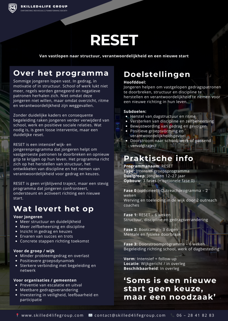 Het programma richt zich niet op praten over problemen, maar op doorbreken van patronen, herstellen van structuur en activeren van verantwoordelijkheid. RESET combineert groepsdynamiek, fysieke en mentale uitdaging, coaching en een duidelijke fasering.