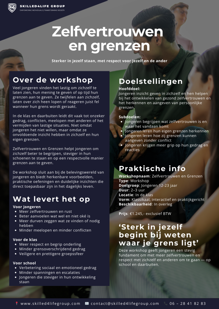 De workshop Zelfvertrouwen en Grenzen helpt jongeren om zichzelf beter te begrijpen, steviger in zichzelf te staan en op een respectvolle manier grenzen aan te geven.